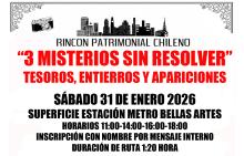 Ruta familiar que relata enigmas de nuestra ciudad relacionados a tesoros, entierros y apariciones, es una ruta corta con duración máxima de 1:20 horas, dentro del casco histórico. Esta actividad tiene contemplada mostrar material de investigación, como aparatos y libros relacionados a lo paranormal. Máximo 100 personas por ruta. Inscripción con nombres de los asistentes por DM Instagram @rinconpatrimonialchileno indicando horario